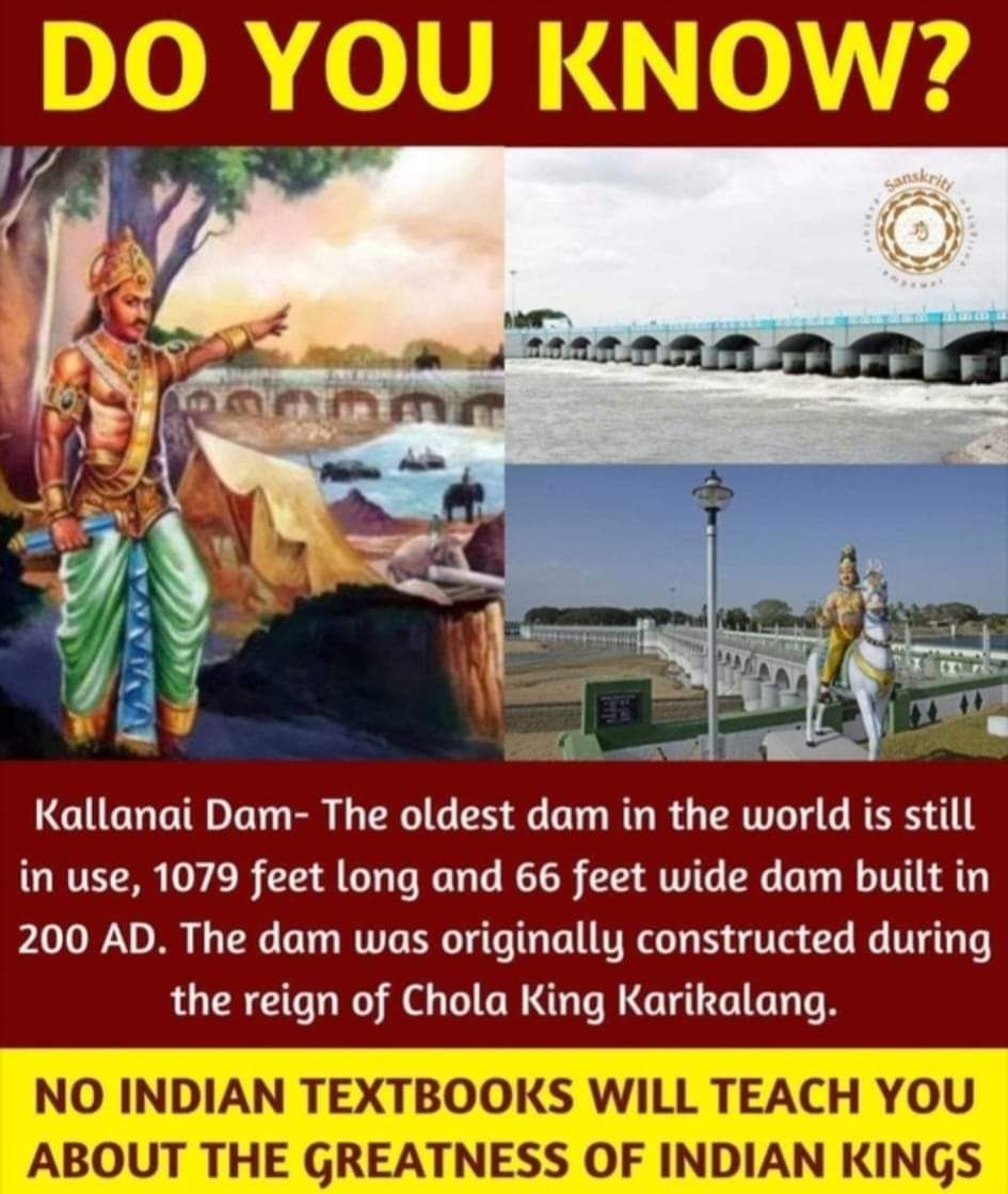 Le plus ancien barrage du monde est toujours utilisé, 1079 pieds de long et 66 pieds de large, construit en 200 après JC. Le barrage a été construit à l'origine sous le règne du roi Chola Karikalang.